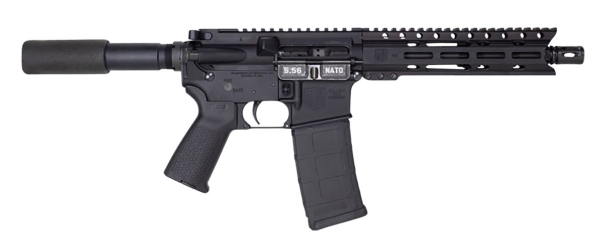 This DB15 Pistol features a carbine-length, medium, 4150 ChromeMoly barrel, pistol-length gas system, and a shot-peened Mil-Spec 8620 bolt carrier. It has 7075-T6 aluminum receivers, 9″ M-Lok handguard, Magpul MOE grip, and a buffer tube foam pad.